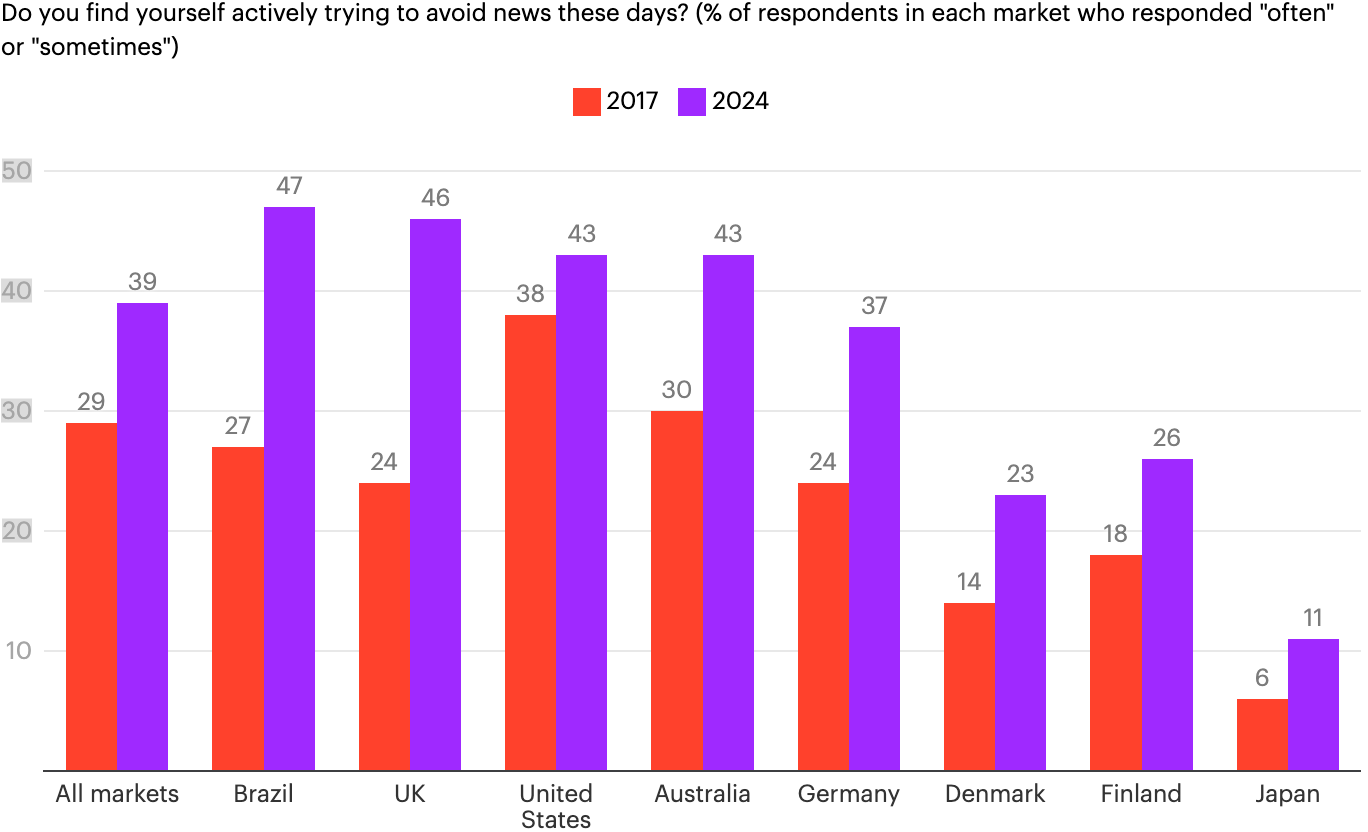 Antalet mÀnniskor som aktivt undviker nyheter fortsÀtter att öka enligt Reuters undersökning Digital News Report 2024. Nu Àr det 39% som svarar att de ibland eller ofta aktivt vÀljer bort nyhetsaktigt innehÄll.