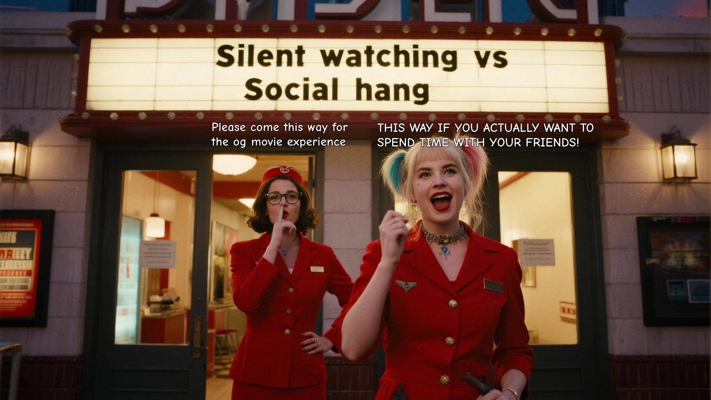 Men Ă€ven icke sanktionerade spontana interaktioner med film sĂ„ som förra Ă„rets kastande av popcorn och skrikande av âChicken Jockeyâ pĂ„ Minecraft the Movie eller att kompisgĂ€ng pratar under filmen ökar.