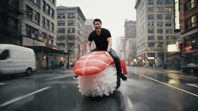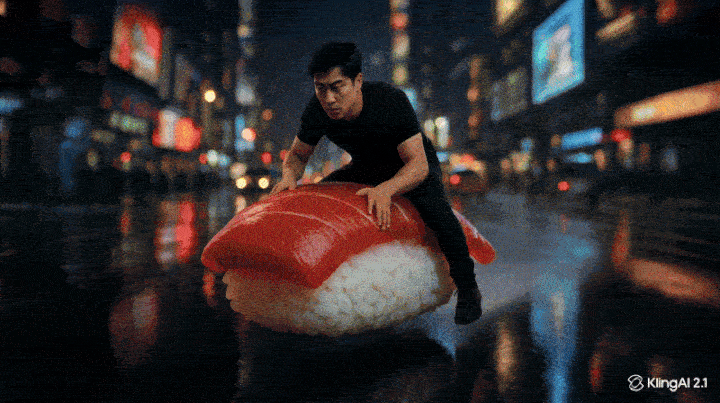 Action highspeed chase. cinematic wide shot of a korean man riding a realistic gigantic nigiri sushi in high speed in the streets of New York. The man is dressed in a black tshirt and black jeans. Pink neon tint, wet streets. Handheld camera following the man zooming in on his face as the korean man smiles and does thumbs up with his left hand.Resultatet blev filmen i toppen av nyhetsbrevet. (Första försöket oediterat, men omgjord till gif sÄ den ska gÄ att se direkt i nyhetsbrevet vilket gör den grynig.)