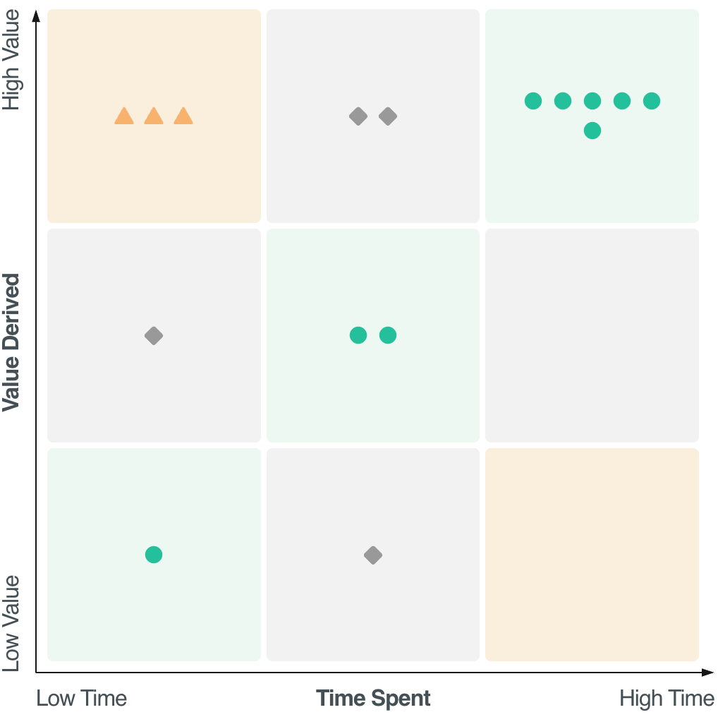 Aktiviteter som kan sluka mycket tid men som inte ger sÄ högt vÀrde har successivt försvunnit frÄn den gula High Time/Low Value-rutan pÄ grund av AI. NÀr jag gÄr igenom min ChatGPT-historik sÄ Àr vardagsaktiviteter och livsresearch mycket mer förekommande Àn den research som skapat vÀrde i mitt arbetsliv. Det Àr uppgifter dÀr jag Àr rÀtt förlÄtande om svaren jag fÄr inte blir 100% kvalitet, svarens syfte Àr att gÄ frÄn att kunna noll till att ha en utgÄngspunkt att förbÀttra.