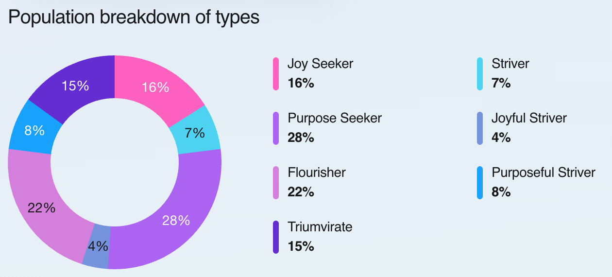Majoriteten av deltagarna klassificeras som âPurpose Seekersâ. För dem korrelerar den upplevda livstillfredsstĂ€llelsen starkt med andelen tid de sjĂ€lva uppfattar som meningsfullt anvĂ€nd (oavsett om den Ă€gnas Ă„t lönearbete eller hushĂ„llssysslor). Stark tvĂ„a Ă€r Flourisher, deras aktiviteter ska vĂ€rderas bĂ„de meningsfulla och roliga för att bidra till livstillfredsstĂ€llelse.
