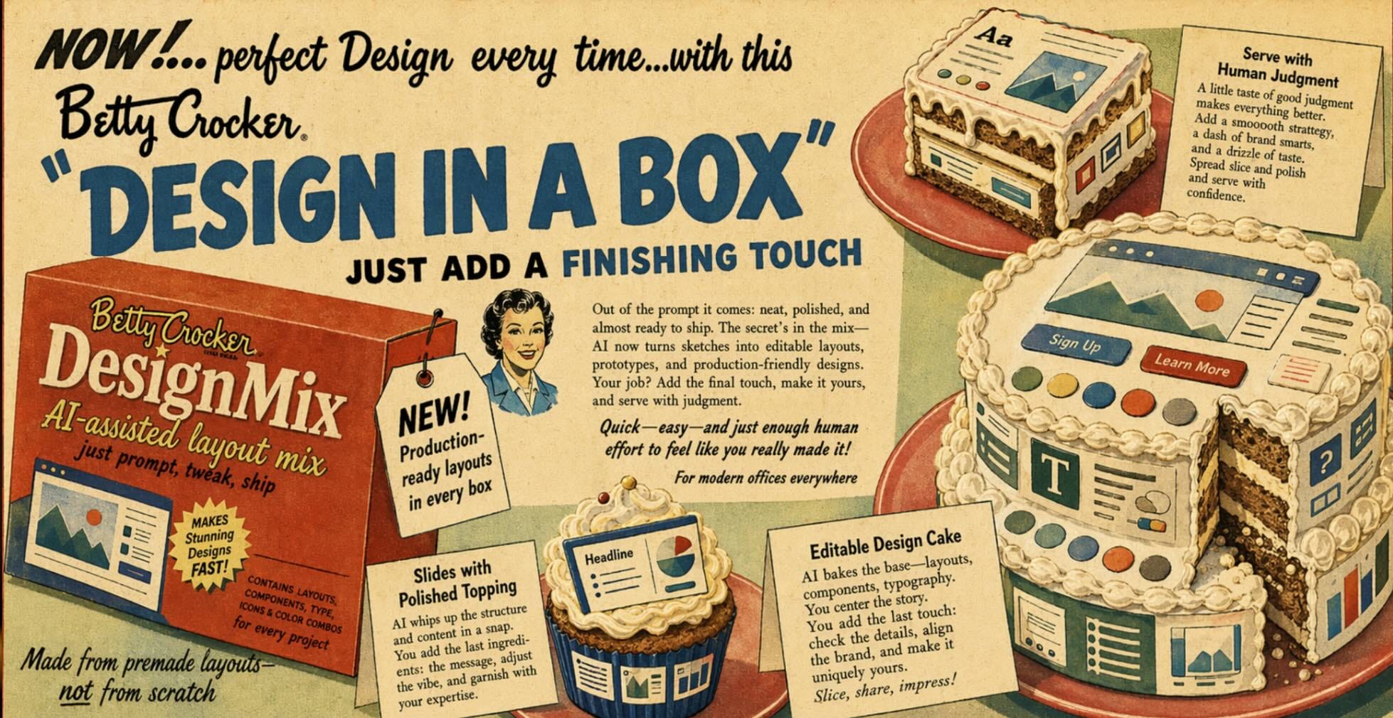 Det vi ser nu Àr en period dÀr AI-företagen kommer ge oss fÀrdiga artefakter men dÀr det blir lÀttare för oss att enkelt fixa till en liten detalj för hand. Det kommer ge samma fördel som nÀr Betty Crockers kakmix blev för enkel att anvÀnda pÄ 1950-talet. Det kÀndes som att fuska att bara addera vatten, sÄ de gjorde om sin produkt sÄ husfruarna behövde knÀcka i ett Àgg och enligt storyn sÄ löste det att de kunde kÀnna att de var de som tillagat kakorna. (Idag pratar vi om IKEA-effekten, som Àr i princip samma)