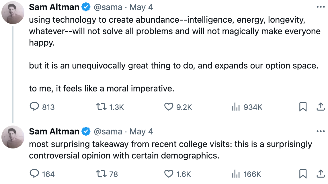 NĂ€r Sam Altman pratar om att det vore omoraliskt av honom att inte skapa AI som kan ge mĂ€nniskor överflöd av intelligens, elektricitet och mĂ€nniskors livslĂ€ngd sĂ„ menar han det. Redan 2016 skapade han en non-profit forskningsorganisation som skulle utreda om prestationsfri medborgarlön (universal basic income). Syftet Ă€r att undersöka om det kan vara ett alternativ för att underlĂ€tta transformationen frĂ„n ett samhĂ€llet dĂ€r mĂ€nniskor mĂ„ste lönejobba till ett samhĂ€lle dĂ€r vi lever i överflöd.Â